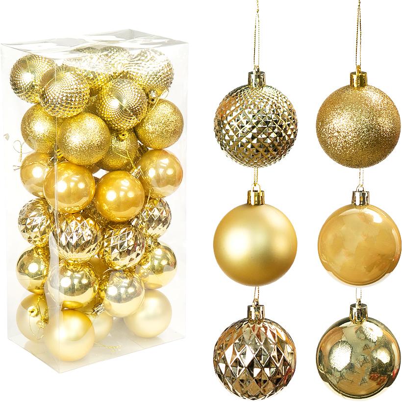 Набір ялинкових куль D6 см (36 шт) — стильний святковий декор для прикрашання новорічної ялинки, вінків та інтер’єру. У комплекті кулі з різними варіантами покриття: матові, глянцеві, блискіткові та рельєфні, що створює цікавий візуальний ефект і додає об’єму композиції. Усі прикраси мають підвіски та готові до використання. Упаковано в прозору коробку розміром 35×17,5×11,5 см, зручно для зберігання та транспортування.