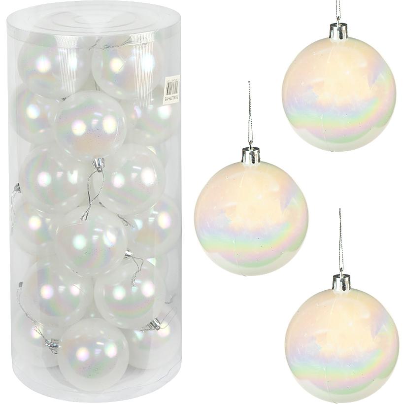 Набір складається з 24 пластикових ялинкових куль діаметром 8 см з ефектним перламутровим покриттям, що надає прикрасам м’якого сяйва та вишуканого вигляду. Такі кулі чудово підійдуть для оздоблення новорічної ялинки, вітрини або святкової фотозони. Кожна куля має підвіску для зручного розвішування. Упаковані у прозорий тубус розміром 19×40 см, зручно для зберігання та подарункового оформлення. Ціна вказана за повний набір.