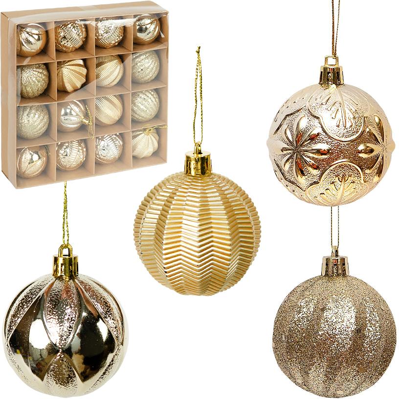 Набір ялинкових прикрас 6279-4 (16 шт.) — вишуканий комплект куль у класичному золотому кольорі. У наборі 16 пластикових куль діаметром 6 см із різним оформленням — матові, глянцеві, з гліттером і рельєфним орнаментом. Поєднання фактур створює благородне сяйво й підкреслює святкову атмосферу. Прикраси виготовлені з міцного, легкого пластику, безпечного для дітей і тварин. Упаковані у картонну коробку з прозорою кришкою розміром 24×24×6 см, зручну для зберігання чи як подарунковий варіант. Ідеально підходять для декору ялинки, оселі, офісу або вітрини.