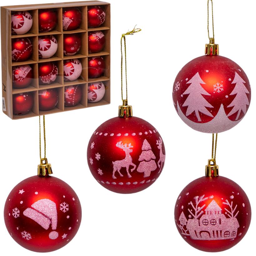 Набір ялинкових прикрас 6279-3 (16 шт.) — святковий комплект пластикових куль у насиченому червоному кольорі з новорічним малюнком із рожевого гліттеру. На кожній кулі зображені зимові сюжети — ялинки, будиночки, олені, сніжинки та шапочка Санти, що створює атмосферу тепла й радості. Діаметр кулі — 6 см. Прикраси легкі, міцні та безпечні для дітей і тварин. Упаковані у картонну коробку з прозорою кришкою розміром 24×24×6 см, зручну для зберігання чи як подарунковий варіант. Ідеально підходять для декору ялинки, оселі, офісу або як святковий подарунок.