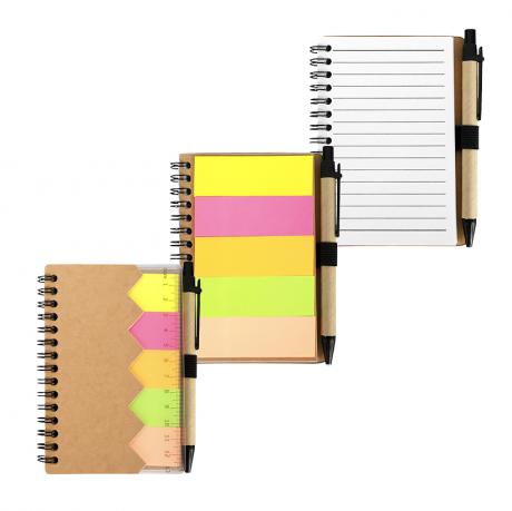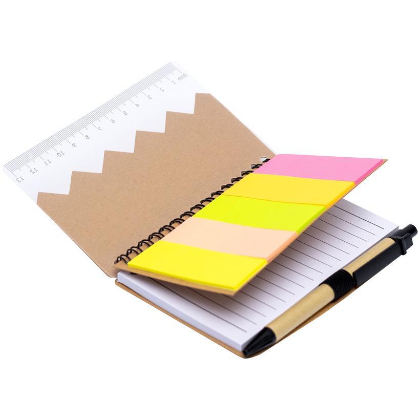 Цей блокнот формату В6 (18*13,5 см) має 64 аркуші в лінію, збірні на спіралі. У комплект входить шарикова ручка з синіми чорнилами та набір паперових стікерів.