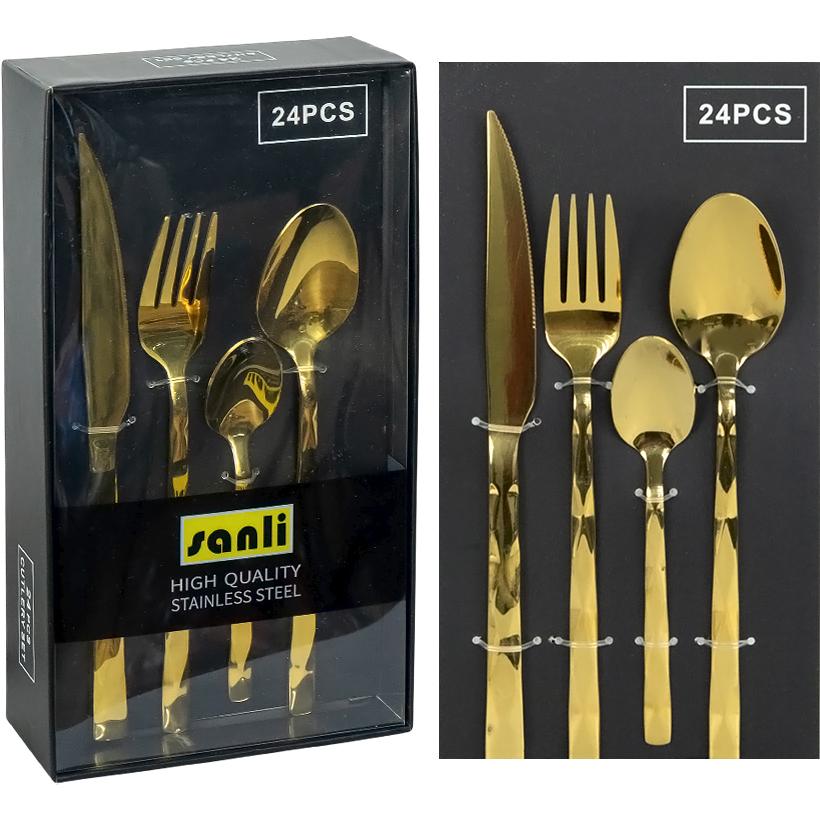 Набір столових приборів з нержавіючої сталі — ідеальне поєднання стилю, зручності та довговічності. У комплект входять 24 предмети: по 6 ножів, виделок, столових і чайних ложок. Прибори виготовлені з якісної нержавіючої сталі, стійкої до корозії та механічних пошкоджень. Ергономічний дизайн і дзеркальна поліровка додають елегантності та комфорту у використанні. Підходять як для щоденного вжитку, так і для святкового столу. Ідеальні для дому чи на подарунок. Розмір упаковки: 25,5×14×6,5 см.