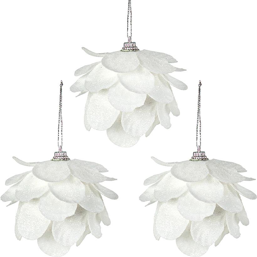 Набір містить три ялинкові іграшки у формі шишок. Матеріал виготовлення – пінопласт з покриттям гліттером. Розмір кожної іграшки становить 8 см на 6 см. Упаковка виконана в пластиковій коробці розміром 20,5 см на 7 см на 7 см. Колір білий. Ціна вказана за набір з трьох штук.