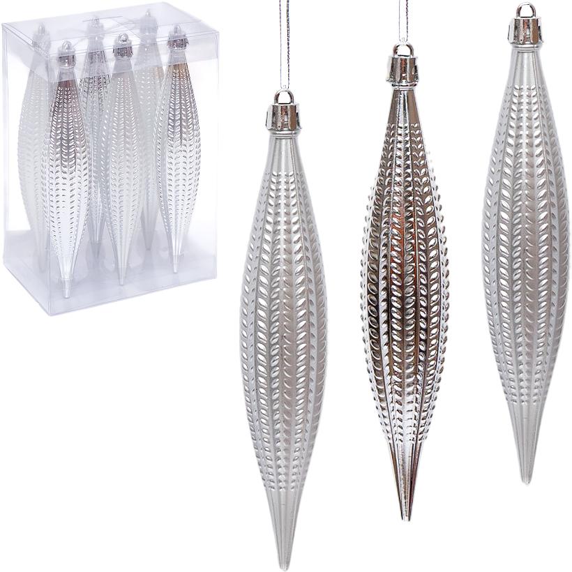 Набір ялинкових прикрас 6279-11S (6 шт.) — стильний комплект підвісних іграшок у срібному кольорі з поєднанням матових і глянцевих поверхонь. У наборі 6 пластикових прикрас довжиною 17 см і діаметром 3,5 см з оригінальним рельєфним візерунком, що підкреслює блиск і глибину кольору. Витягнута форма надає прикрасам витонченості та легкості, гармонійно поєднуючись із кулями та іншими новорічними елементами. Виготовлені з легкого, міцного пластику, безпечного для дітей і тварин. Упаковані в прозору пластикову коробку розміром 13×8×18 см. Ціна вказана за набір із 6 штук. Ідеально підходять для декору ялинки, святкових композицій або зимового інтер’єру.