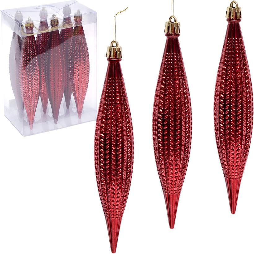 Набір ялинкових прикрас 6279-11R (6 шт.) — стильний комплект підвісних іграшок у насиченому рубіновому кольорі з поєднанням матових і глянцевих поверхонь. У наборі 6 пластикових прикрас довжиною 17 см і діаметром 3,5 см з оригінальним рельєфним візерунком, що підкреслює глибину кольору та блиск покриття. Витягнута форма надає прикрасам витонченості й легкості, чудово поєднуючись із кулями та іншими новорічними елементами. Виготовлені з легкого, міцного пластику, безпечного для дітей і тварин. Упаковані в прозору пластикову коробку розміром 13×8×18 см. Ціна вказана за набір із 6 штук. Ідеально підходять для декору ялинки, святкових композицій чи зимового інтер’єру.