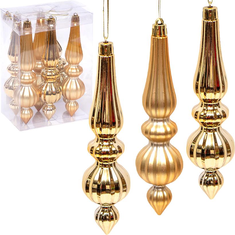 Набір ялинкових прикрас 6279-12G (6 шт.) — вишуканий комплект підвісних іграшок у класичному золотому кольорі. У наборі 6 пластикових прикрас розміром 17×4 см, виконаних у витягнутій елегантній формі. До комплекту входять три матові та три глянцеві прикраси одного відтінку, що створюють ефект розкішного сяйва та гармонії на ялинці. Виготовлені з легкого, міцного пластику, безпечного для дітей і тварин. Упаковані у прозору пластикову коробку 12×17×8 см, зручну для зберігання чи подарункового оформлення. Ціна вказана за набір із 6 штук. Ідеально підходять для декору ялинки, святкових композицій або новорічного інтер’єру.