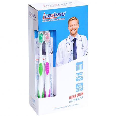 Набір зубних щіток «Lanshare» 698-2 призначений для щоденної гігієни ротової порожнини та зручний для регулярного використання. У комплект входять 2 зубні щітки довжиною 19 см, розміщені на одному блістері. Щітки оснащені синтетичною щетиною, яка ефективно видаляє зубний наліт і залишки їжі, забезпечуючи якісне очищення зубів і міжзубних проміжків. Робоча головка має зону для очищення язика, що допомагає зменшити кількість бактерій і підтримувати свіже дихання. Індивідуальна упаковка — блістер розміром 4×23 см — зручна для викладки та зберігання. Транспортна упаковка 6,5×12×23,5 см містить 12 наборів і оптимально підходить для оптового продажу.
