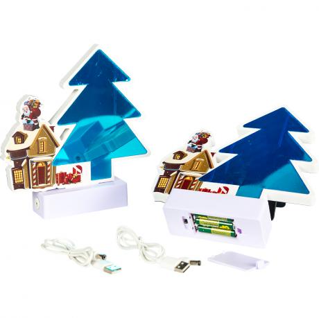 Світлодіодний нічник "Ялинка" RH-2 має розмір 20×19 см. Живлення здійснюється від мережі 220 В через USB або від 3 батарейок типу AAA (батарейки не входять до комплекту). Нічник створює 3D-ефект, що додає святкової атмосфери.