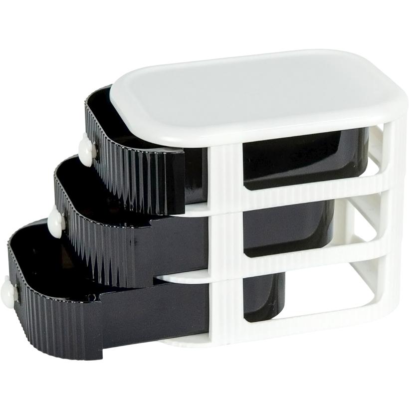 Настільний органайзер розміром 13х14х18см з трьома відділеннями. Призначений для зберігання канцелярських товарів, дрібних аксесуарів або косметики. Має прозорі висувні шухлядки з декоративними ручками для легкого доступу до вмісту. Корпус органайзера білого кольору. Підходить для використання в офісі, дома або на навчальному столі.