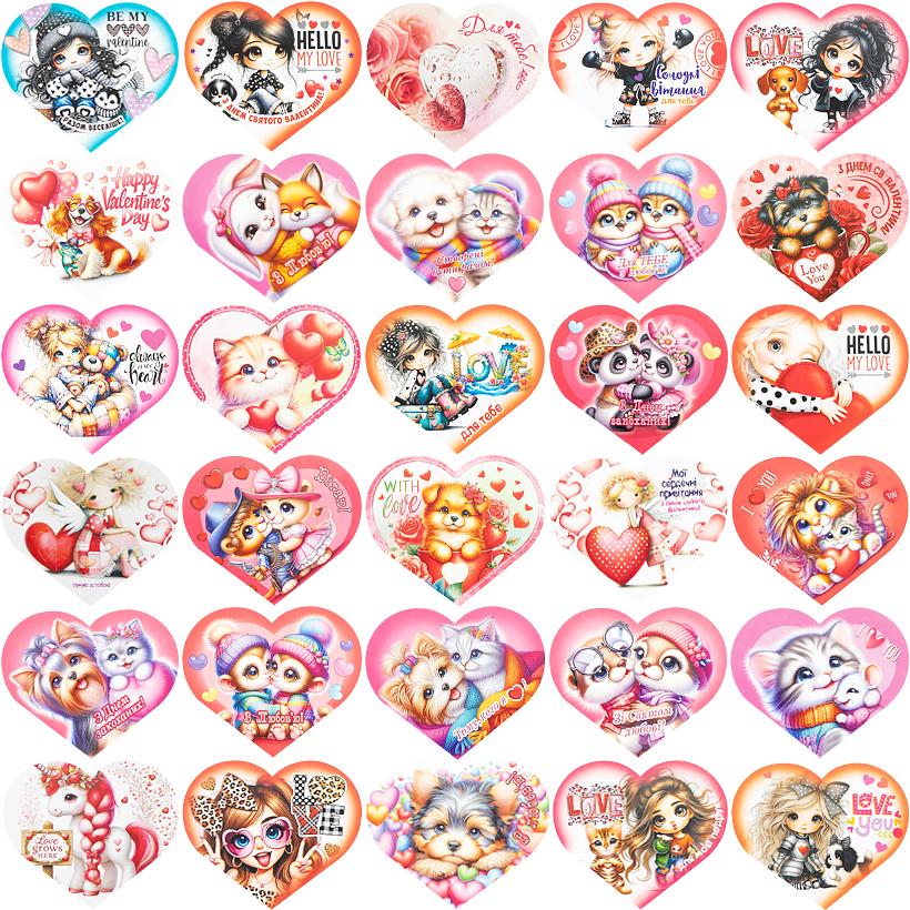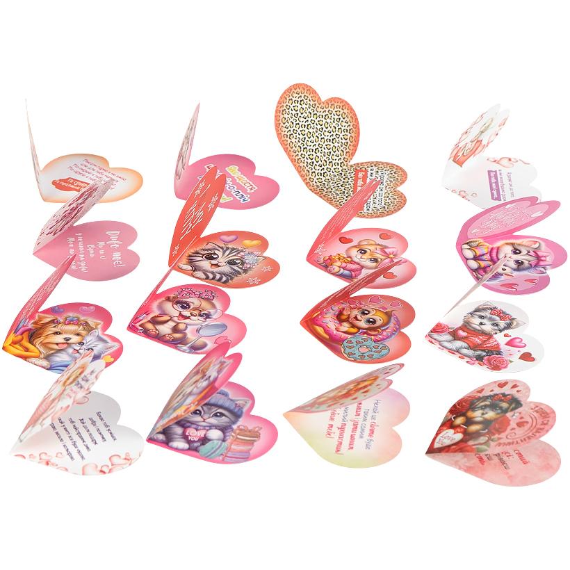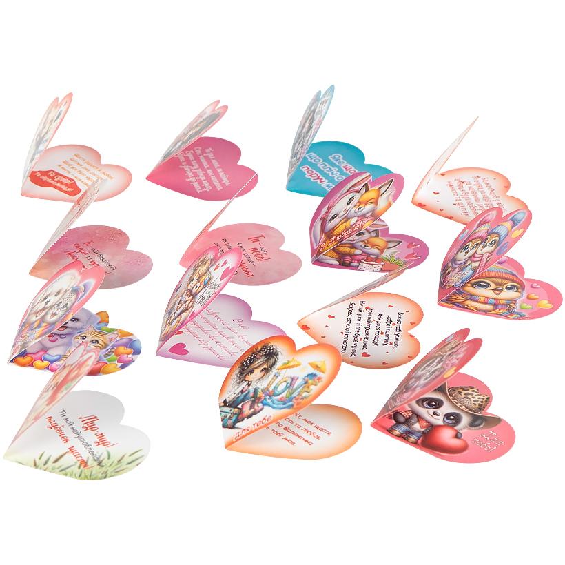 Вітальна листівка «Валентинка» у формі серця — стильний та універсальний варіант для привітань до Дня святого Валентина та інших романтичних подій. Розмір листівки 173х94 мм , зручний для вручення та доповнення подарунків. В одній упаковці 30 різних дизайнів, кожен дизайн по 10 штук, що робить набір вигідним для роздрібної торгівлі та оптових продажів. Листівки чудово підходять для магазинів подарунків, канцелярії та святкового асортименту.