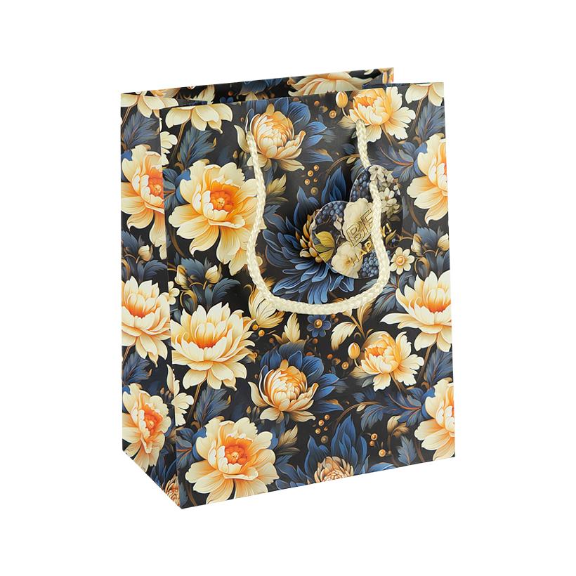 Паперовий пакет розміром 18х23х10 см виготовлений з художнього паперу 140 г/м². Має повнокольоровий друк та матову ламінацію. Оснащений звичайною мотузковою ручкою 5 мм з поліпропілену та кліпсою. У комплекті є подарунковий ярлик. В одній упаковці представлений один дизайн.