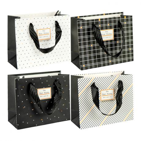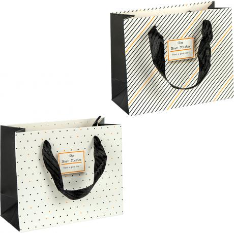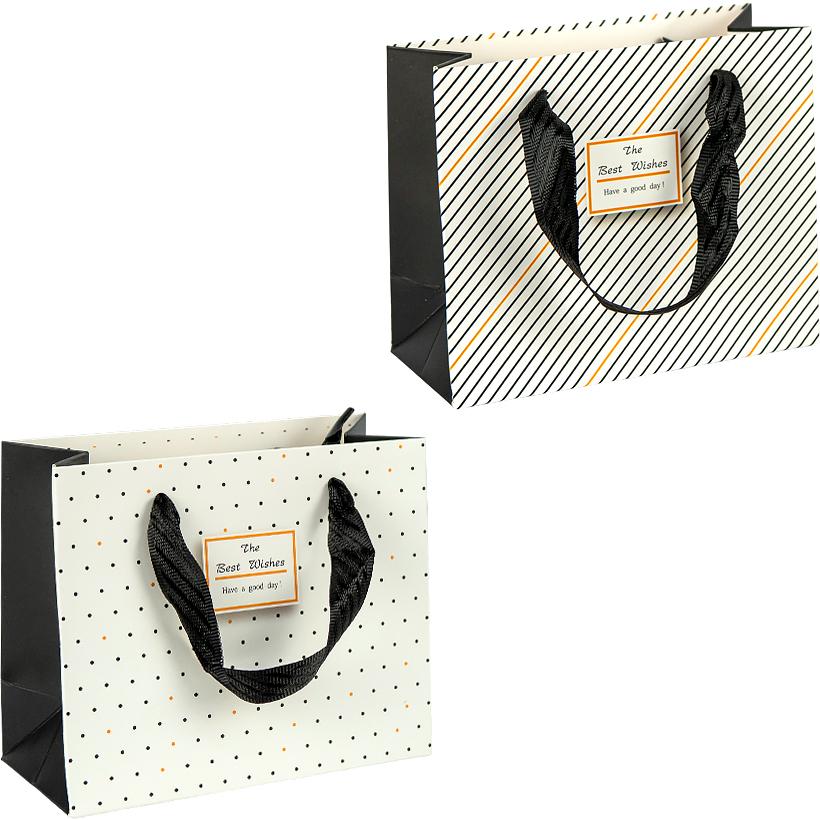 Подарунковий пакет горизонтального формату з принтом — універсальне рішення для акуратного пакування товарів. Висота — 18 см, ширина — 23 см, розмір дна — 10 см. Матеріал — щільний картон, ручка виконана з текстильної стрічки. Ціна вказана за 1 одиницю товару, продається упаковкою по 12 шт. Підходить для пакування косметики, аксесуарів, сувенірів і невеликих виробів. Стійке дно та зручні ручки забезпечують надійність під час перенесення. Товар вигідний для оптових магазинів і підходить для роздрібного продажу.