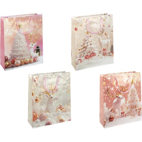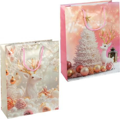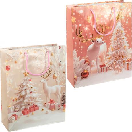 Подарунковий пакет новорічної серії розміром 18×21,5×8 см — стильне рішення для святкового пакування невеликих подарунків, солодощів і сувенірів. Виготовлений із щільного ламінованого паперу з глянцевим покриттям, стійким до вологи та пошкоджень. Яскравий дизайн із зимовими та новорічними мотивами створює атмосферу затишку та радості. Зручні шнуркові ручки забезпечують комфорт під час перенесення. В упаковці 12 штук (4 різні дизайни) — чудовий вибір для магазинів і оптових закупівель.
