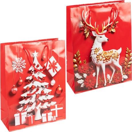 Подарунковий пакет новорічної серії розміром 18×21,5×8 см — стильне рішення для святкового пакування невеликих подарунків, солодощів і сувенірів. Виготовлений із щільного ламінованого паперу з глянцевим покриттям, стійким до вологи та пошкоджень. Яскравий дизайн із зимовими та новорічними мотивами створює атмосферу затишку та радості. Зручні шнуркові ручки забезпечують комфорт під час перенесення. В упаковці 12 штук (4 різні дизайни) — чудовий вибір для магазинів і оптових закупівель.