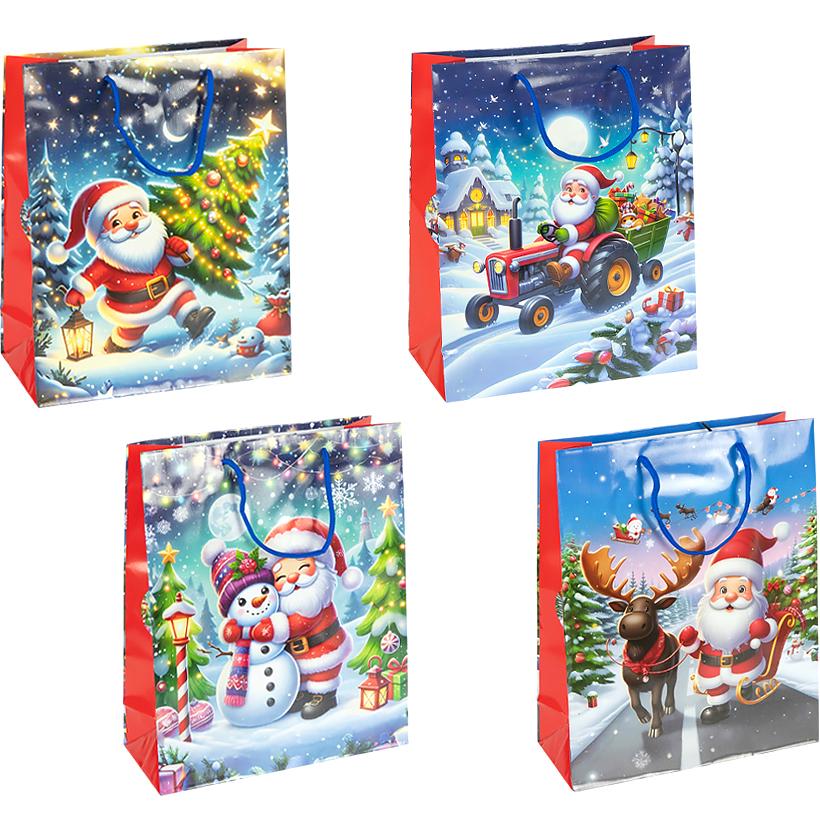 Подарунковий пакет новорічної серії розміром 26×32×10 см — універсальне рішення для святкового пакування. Виготовлений із щільного ламінованого паперу з глянцевим покриттям, стійким до вологи та пошкоджень. Яскравий дизайн із новорічними сюжетами створює атмосферу свята та чудово підходить для пакування солодощів, сувенірів і подарунків. Пакет має міцні шнуркові ручки, зручні для перенесення. В упаковці 12 штук (4 різні дизайни) — практичний варіант для роздрібного та оптового продажу.