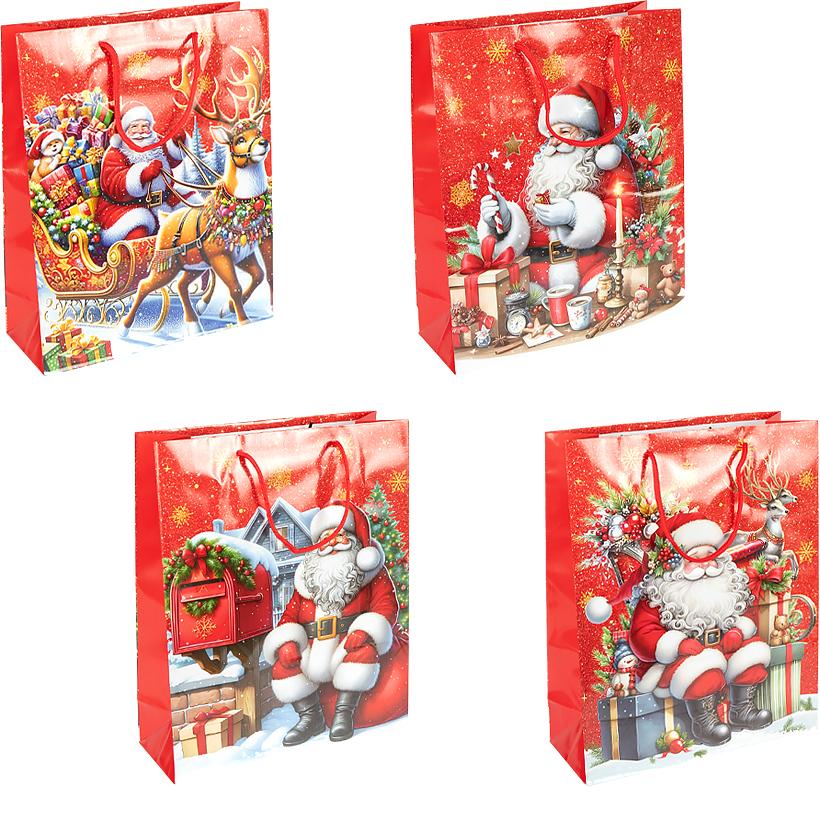 Подарунковий пакет новорічної серії розміром 26×32×10 см — універсальне рішення для святкового пакування. Виготовлений із щільного ламінованого паперу з глянцевим покриттям, стійким до вологи та пошкоджень. Яскравий дизайн із новорічними сюжетами створює атмосферу свята та чудово підходить для пакування солодощів, сувенірів і подарунків. Пакет має міцні шнуркові ручки, зручні для перенесення. В упаковці 12 штук (4 різні дизайни) — практичний варіант для роздрібного та оптового продажу.