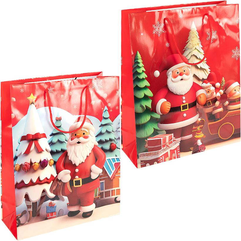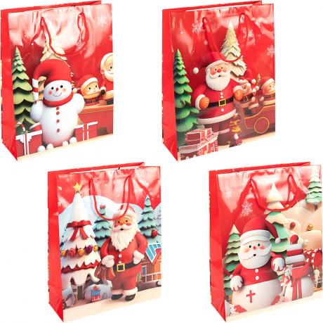 Подарунковий пакет «Новорічні персонажі» розміром 32×44×11 см — яскрава святкова упаковка для новорічних подарунків. Виготовлений із щільного ламінованого паперу з глянцевим покриттям, що надає блиску та захищає від вологи. На пакетах зображені Дід Мороз, сніговики та зимові декорації в мультяшному стилі. У наборі — 12 штук (4 різні дизайни). Пакети мають міцні шнуркові ручки, зручні для перенесення. Ідеально підходять для пакування солодощів, сувенірів і святкових подарунків.