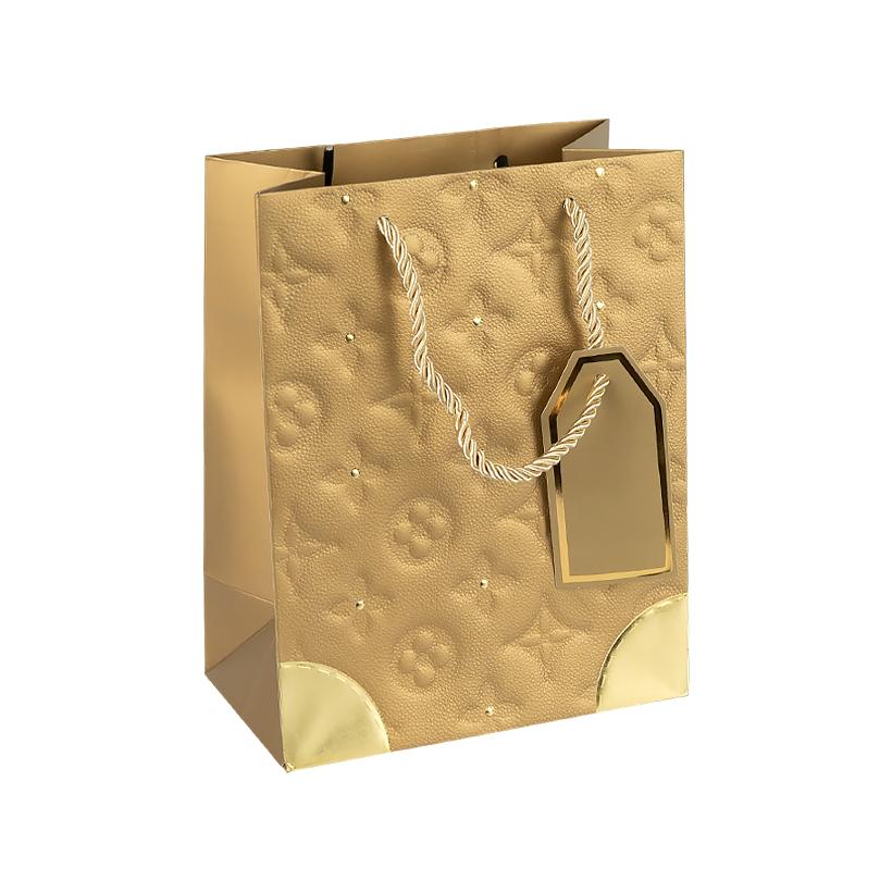 Подарунковий пакет із декоративним золотим оформленням — стильне рішення для презентабельного пакування товарів. Висота — 32 см, ширина — 26 см, ширина дна — 12 см. Матеріал — щільний картон із фактурним тисненням, ручка виконана з текстильного шнура. Золотий декор і посилені кутики розташовані на лицьовій стороні пакета. Пакет підходить для пакування одягу, косметичних наборів і коробок середнього формату. Міцна конструкція та стійке дно забезпечують зручність під час перенесення. Товар вигідний для оптових магазинів і підходить для роздрібного продажу. Ціна вказана за 1 одиницю товару, продається упаковкою по 12 шт.