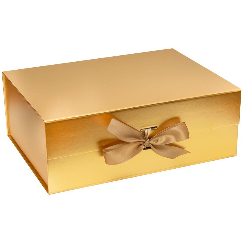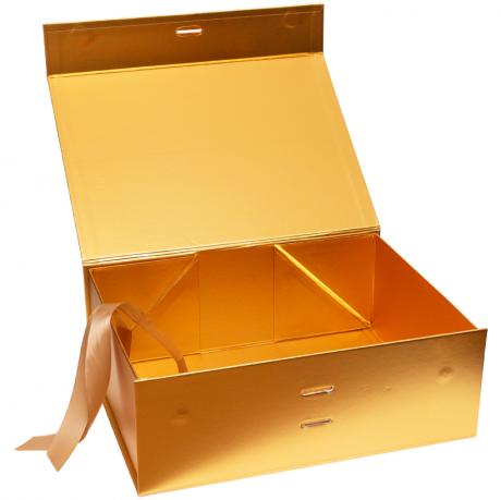 Подарункова складна коробка зі стрічкою призначена для оформлення подарунків та презентаційної упаковки. Розмір у зібраному вигляді — 28,2×20,2×9,2 см. Розмір в упаковочному пакеті — 38х28 см. Коробка золотого кольору. Кришка фіксується за допомогою магнітів і додатково оформлена стрічкою, яка акуратно протягується через спеціальні отвори та з’єднує кришку з коробкою, забезпечуючи надійне закриття й охайний вигляд. Конструкція складна, кути фіксуються за допомогою вже нанесеної двосторонньої клейкої стрічки, що гарантує міцність форми та зручність складання. Товар вигідний для оптових магазинів і підходить для роздрібного продажу.