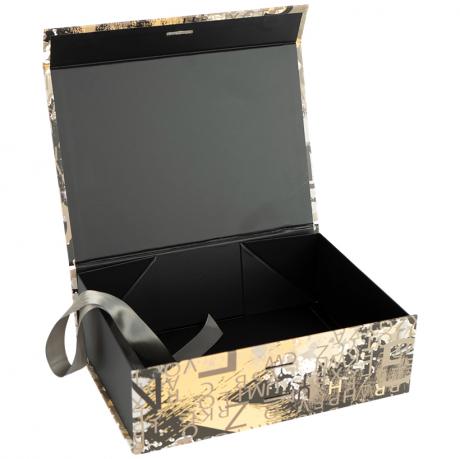 Подарункова складна коробка зі стрічкою призначена для оформлення подарунків та презентаційної упаковки. Розмір у зібраному вигляді — 33×25×12 см. Розмір в упаковочному пакеті — 48,8×33 см. Коробка чорна з принтом. Кришка фіксується за допомогою магнітів і додатково оформлена стрічкою, яка акуратно протягується через спеціальні отвори та з’єднує кришку з коробкою, забезпечуючи надійне закриття й охайний вигляд. Конструкція складна, кути фіксуються за допомогою вже нанесеної двосторонньої клейкої стрічки, що гарантує міцність форми та зручність складання. Товар вигідний для оптових магазинів і підходить для роздрібного продажу.