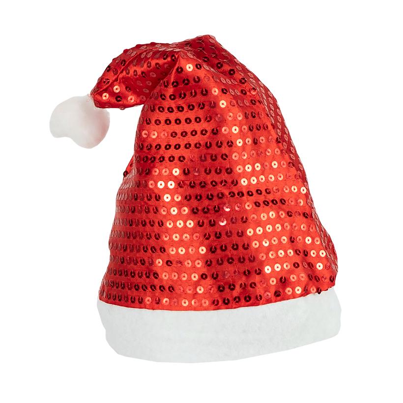 Шапка Діда Мороза з паєтками, виготовлена з м’якого матеріалу з білою хутряною окантовкою та пухнастим помпоном. Яскраві блискучі паєтки створюють святковий та ошатний ефект, переливаючись при освітленні. Обхват — 56 см, довжина — 35 см. Ідеально підійде для новорічних вечірок, корпоративів, ранків і фотосесій.