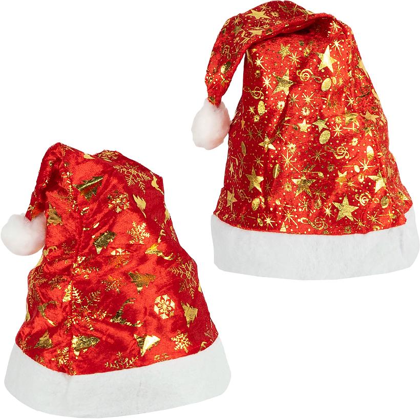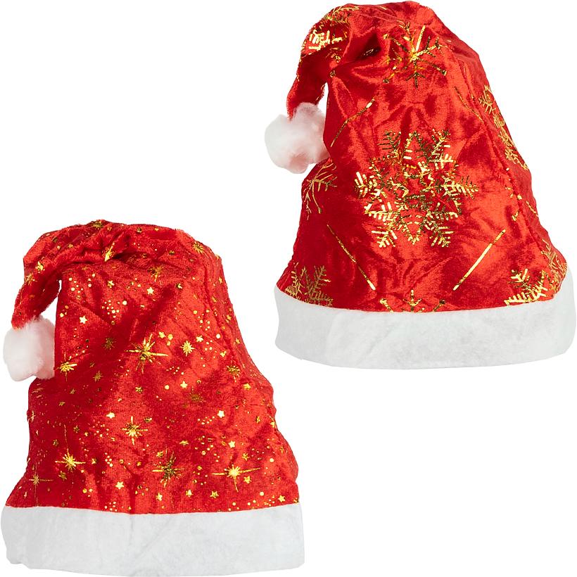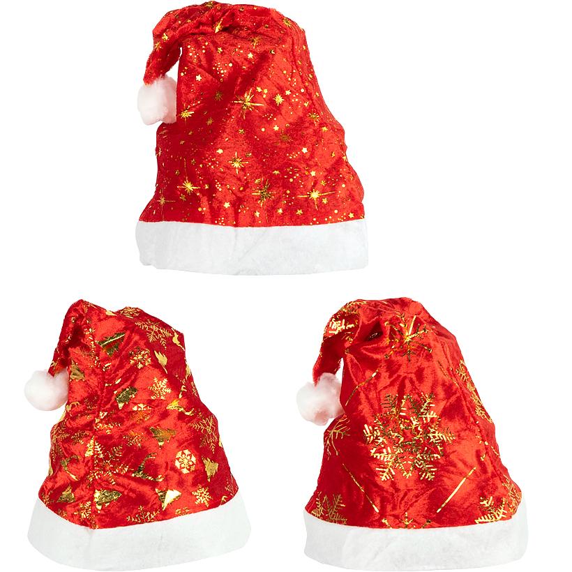 Новорічна шапка з блискучим узорним декором, виготовлена з м’якого матеріалу з білою хутряною окантовкою та пухнастим помпоном. Прикрашена святковими візерунками, що гарно переливаються на світлі. Обхват — 56 см, висота — 40 см. Ідеально підходить для новорічних вечірок, корпоративів, ранок та фотосесій.
