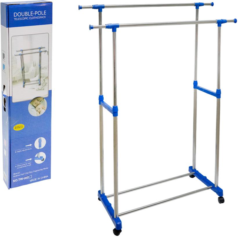 Стійка для одягу подвійна пересувна TW-999 призначена для зручного зберігання одягу вдома, у магазині, шоурумі або на складі. Конструкція оснащена двома перекладинами різної висоти, що дозволяє розміщувати одяг різної довжини. Каркас виготовлений з металевих трубок із міцними пластиковими з’єднаннями, забезпечує хорошу стійкість і витримує навантаження до 40 кг. Основа на коліщатках робить стійку мобільною та зручною для переміщення. Розмір виробу — 157×123×77 см, висота передньої перекладини — 143 см, задньої — 157 см. Стійка легко збирається без інструментів. Постачається в компактній коробці з ручкою, розмір упаковки 78×20×8 см, що зручно для транспортування та оптових продажів.