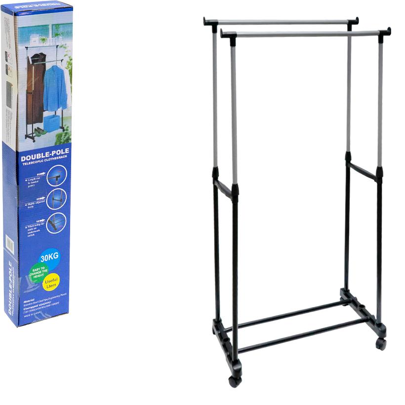Подвійна стійка для одягу TW-999 — практичне та стійке рішення для зберігання й демонстрації одягу в магазині, гардеробній, удома або в офісі. Конструкція розміром 68×40×135 см оснащена двома перекладинами різної висоти: передня — 135 см, задня — 140 см, що зручно для розміщення одягу різної довжини. Металевий каркас забезпечує надійність при щоденному використанні та витримує навантаження до 30 кг. Нижня перекладина підходить для зберігання взуття або коробок. Стійка на коліщатках, мобільна, легко переміщується та швидко збирається без інструментів. Універсальний дизайн робить модель затребуваною для роздрібних і оптових продажів. Постачається в компактній упаковці розміром 66×12×7 см, зручній для транспортування та зберігання.