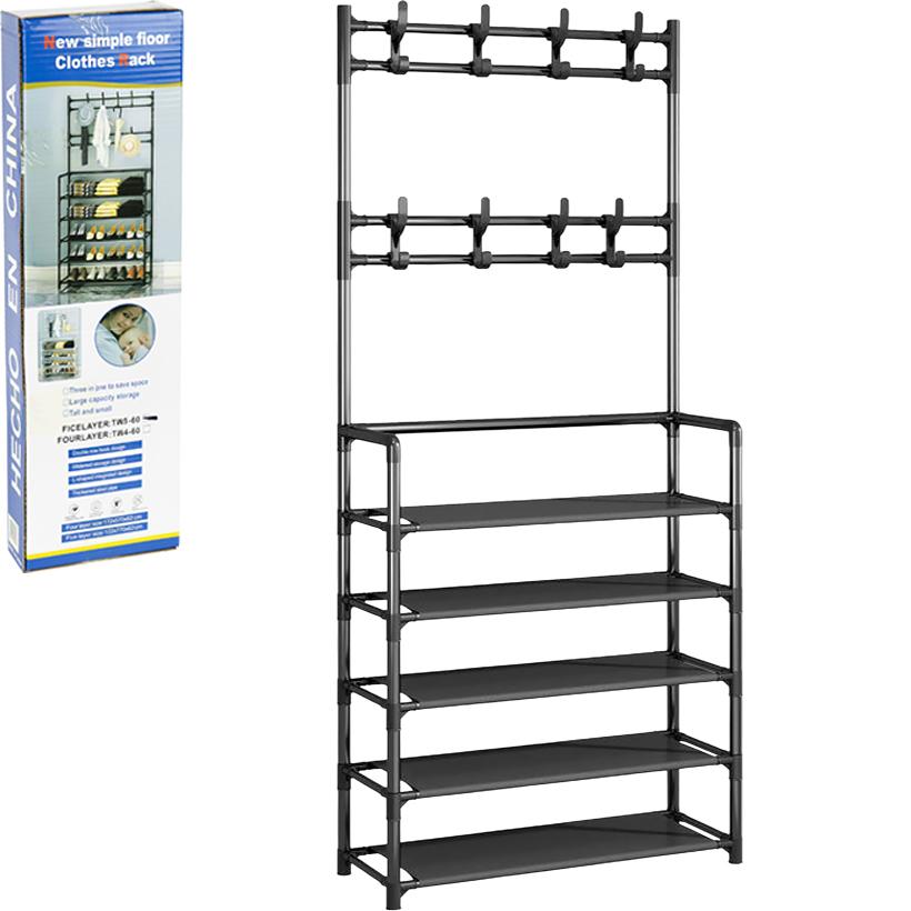 Стійка-вішалка для одягу та взуття призначена для зручного зберігання речей удома. Розмір конструкції — 172×77×62 см, що забезпечує збільшений об’єм розміщення одягу. Модель оснащена п’ятьма полицями для взуття, коробок і аксесуарів, а дворівнева система перекладин і гачків дозволяє зручно розміщувати одяг різних типів і розмірів. Каркас виготовлений із потовщеної труби з вуглецевої сталі, що гарантує міцність і стійкість конструкції. Надійна основа витримує щоденне навантаження. Стійка легко встановлюється та підходить для спальні, гардеробної або передпокою. Товар вигідний для оптових магазинів і підходить для роздрібного продажу.
