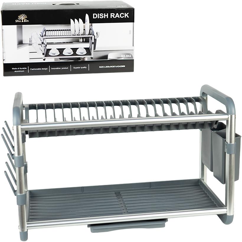 Двоярусна настільна сушарка для посуду призначена для зручного та компактного зберігання і сушіння тарілок, чашок і столових приборів. Виготовлена з алюмінію та міцного пластику, стійка до вологи та корозії. Оснащена зручною ручкою для перенесення, що забезпечує комфорт у використанні. Сучасний дизайн робить сушарку практичним і стильним елементом кухні.