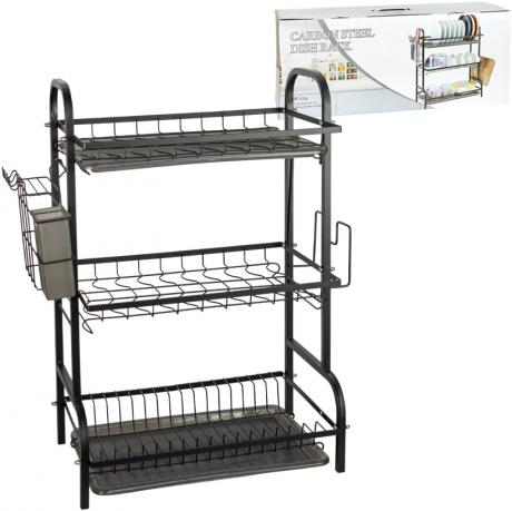 Настільна триярусна сушарка для посуду H4239/DZ-3332 — містке та практичне рішення для кухні. Оснащена двома піддонами для збору води (передбачене місце для третього піддона, але він не входить до комплекту). Є тримач для обробних дощок, тримач для 4 чашок, а також пластиковий піддон для ложок з отворами для зливу води розміром 5×7×12 см. Додатково передбачений металевий тримач для ножів, лопаток та кухонного приладдя розміром 15×13×5 см. Розмір сушарки без тримачів — 63×42×25 см. Розмір упаковки з ручкою для перенесення — 63×26×15 см. Ідеально підходить для зручної організації та сушіння посуду вдома.