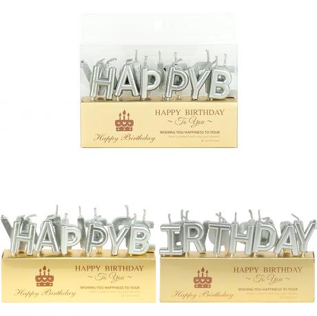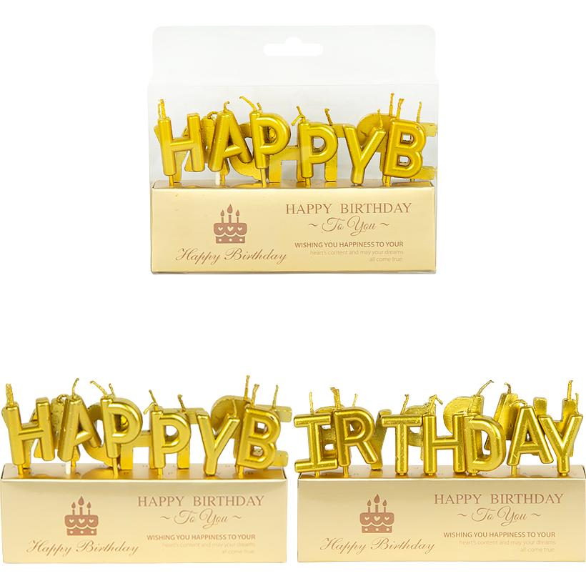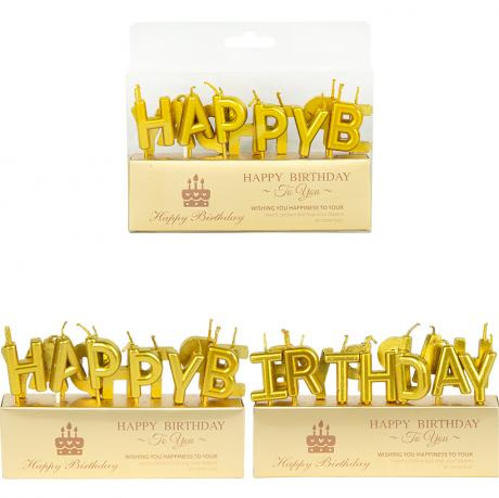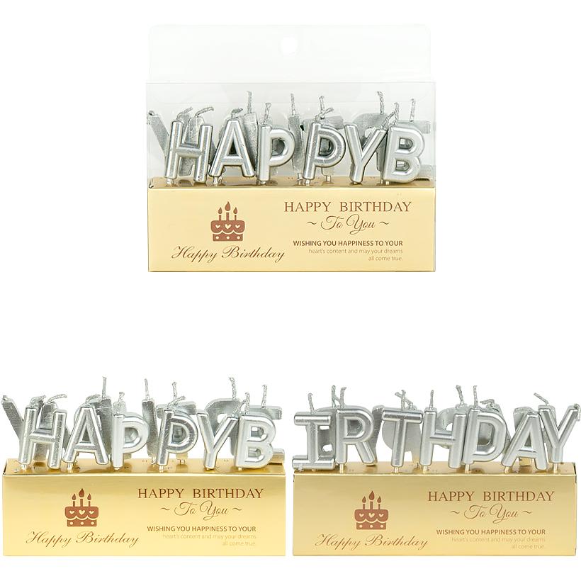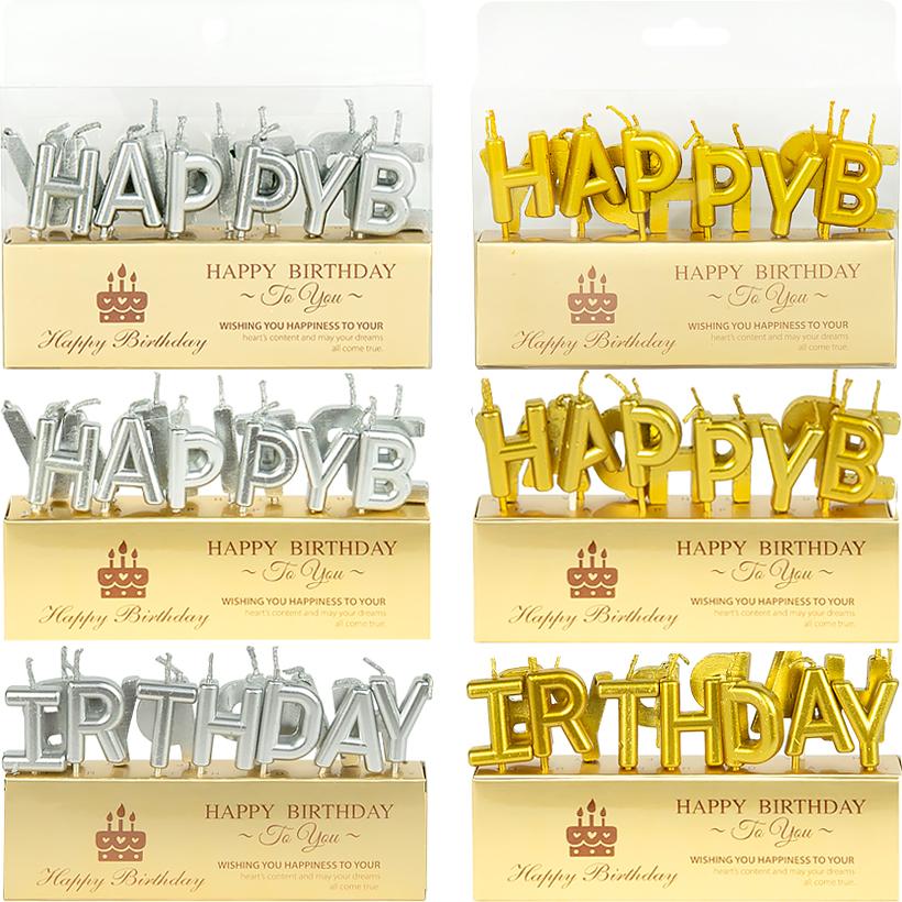 Свічки у вигляді літер для прикрашання торта з написом HAPPY BIRTHDAY. Літери виконані у стильному золотому та сріблястому кольорі, що робить їх універсальними для будь-якого свята. Завдяки компактному розміру свічки легко встановити на торт чи пиріг, вони створюють святкову атмосферу та гарно виглядають на фото.