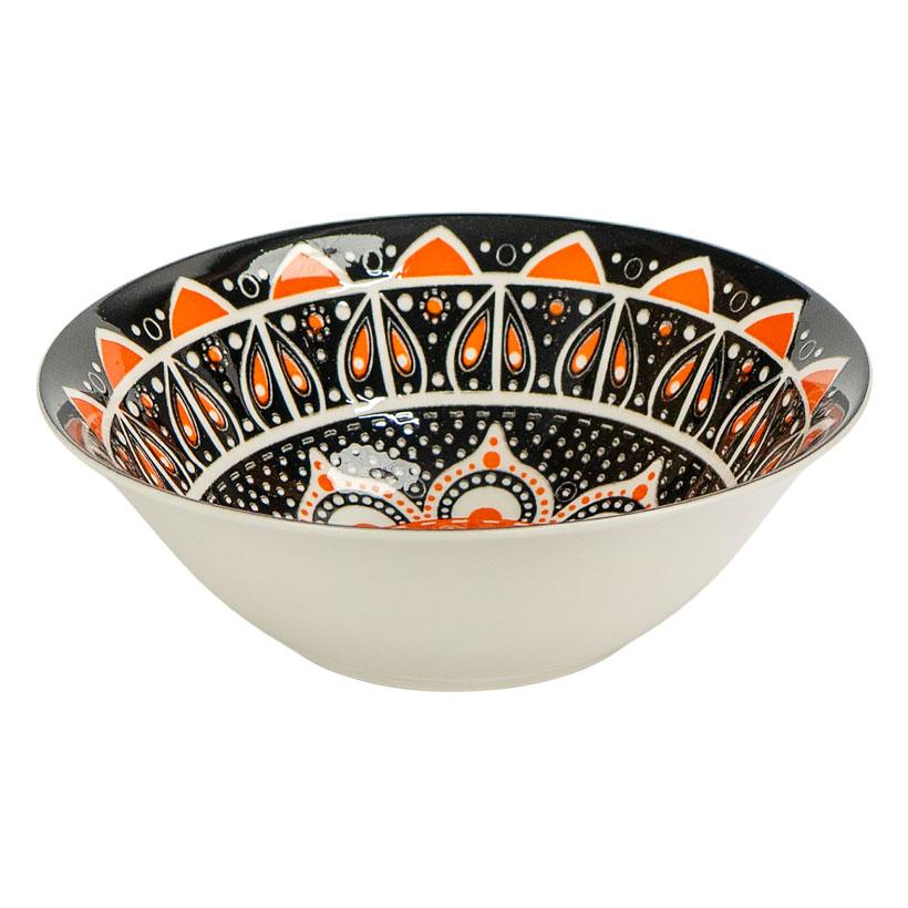 Супова тарілка з чорно-білим орнаментом у стилі мандали, діаметр 20 см, висота 6 см, об’єм 500 мл. Виготовлена з міцної кераміки з молочно-білою основою. Прикрашена вишуканим г ...