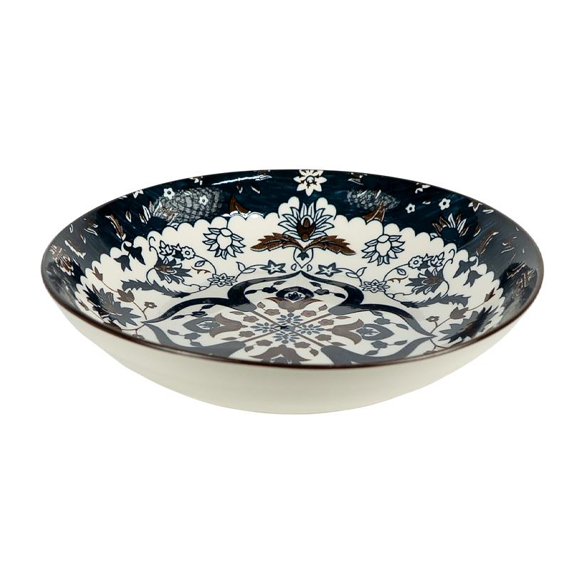 Керамічна тарілка діаметром 18 см і висотою 5 см з декоративним синьо-білим квітковим орнаментом у східному стилі. Об’єм 300 мл. Виготовлена з міцної кераміки з гладким глянцевим покриттям, стійким до щоденного використання. Підходить для подачі перших страв, каш, салатів, закусок та гарнірів. Гармонійно доповнює сервіровку столу та поєднується з іншими виробами серії.