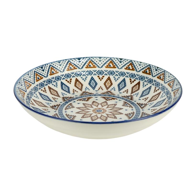 Керамічна тарілка діаметром 18 см і висотою 5 см, об’єм 300 мл. Дизайн виконаний у яскравому етнічному стилі з геометричним орнаментом у синьо-коричневих та теракотових відтінках. Центральний візерунок і декоративна окантовка по краю надають виробу виразного та колоритного вигляду. Тарілка виготовлена з міцної кераміки з глянцевим покриттям, придатна для щоденного використання. Ідеально підходить для подачі супів, салатів, каш, гарнірів та інших страв, а також для ефектного сервірування столу.