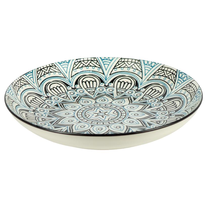 Керамічна тарілка універсального призначення діаметром 20,5 см і висотою 5,5 см, об’єм 500 мл. Виготовлена з міцної кераміки кремового кольору та оздоблена виразним геометричним орнаментом у блакитно-синій гамі зі східними мотивами. Деталізований симетричний візерунок надає виробу сучасного та декоративного вигляду й робить його гармонійним елементом сервірування. Тарілка підходить для щоденного використання та ідеальна для подачі супів, салатів, пасти, каш і других страв.