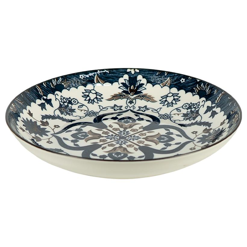 Керамічна тарілка універсального призначення діаметром 20,5 см і висотою 5,5 см, об’єм 500 мл. Виготовлена з міцної кераміки кремового кольору та оздоблена виразним орнаментом у темно-синій і сіро-бежевій гамі з квітковими та східними мотивами. Контрастний візерунок надає виробу стильного та ефектного вигляду й робить його акцентом сервірування. Тарілка підходить для щоденного використання та ідеальна для подачі супів, салатів, пасти, каш і других страв.