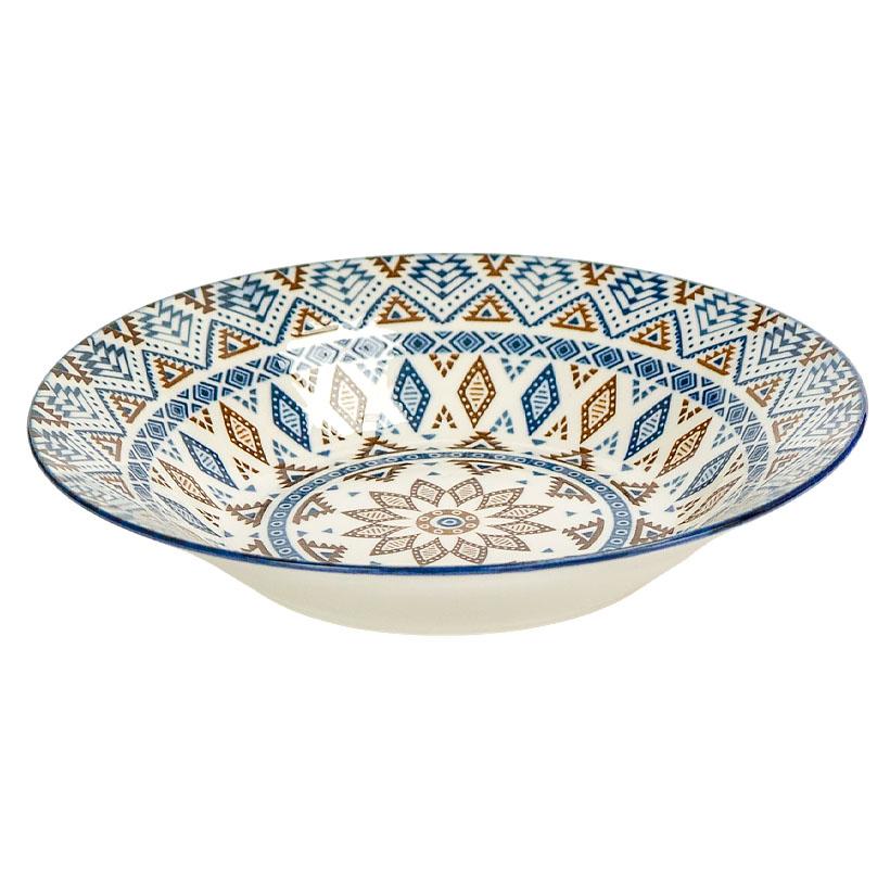 Керамічна тарілка з візерунком — вишуканий елемент сервірування, що поєднує красу та практичність. Діаметр 20 см, висота 6 см, об’єм 500 мл. Прикрашена стильним етнічним орнаментом у синьо-коричневій гамі, який додає затишку та гармонії будь-якому інтер’єру. Підходить для подачі супів, пасти, салатів і других страв. Міцна кераміка стійка до відколів і легко миється. Ідеальний вибір для щоденного використання та святкової сервіровки.