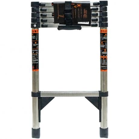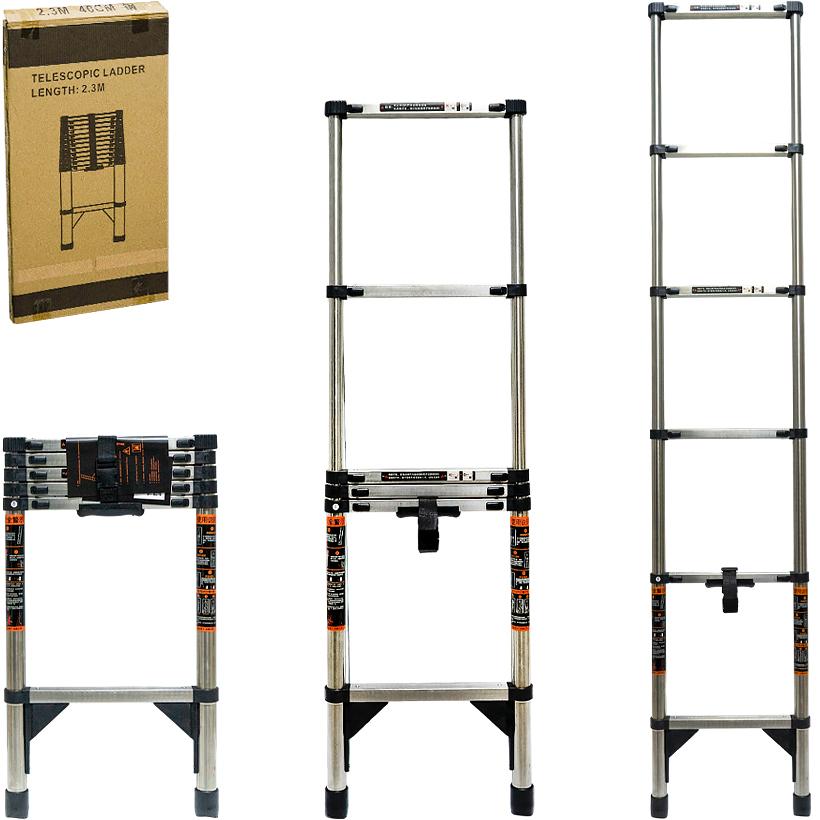 Складна телескопічна драбина з нержавіючої сталі, витримує навантаження до 150 кг. У складеному вигляді — 80 см заввишки, ширина 40 см. Оснащена ременями для фіксації та зручною ручкою для перенесення. Упаковка: 45×5,5×81 см, вага — 6 кг. У комплекті — 2 запасних фіксатори. Ідеально підходить для використання вдома, в майстерні, на дачі або під час обслуговування.