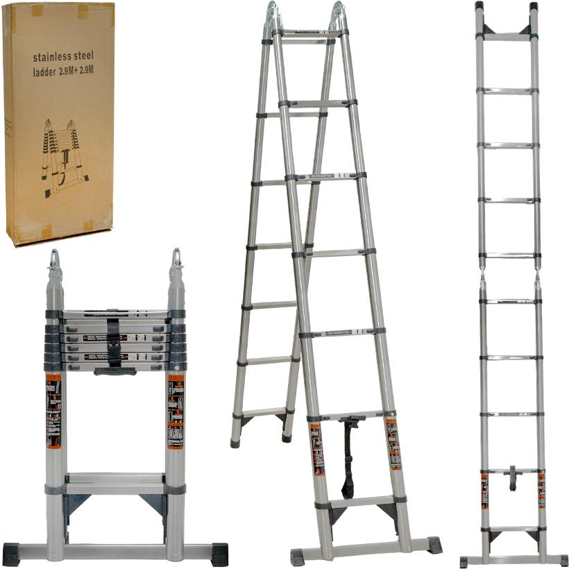 Професійна телескопічна драбина з нержавіючої сталі висотою 2,9 м + 2,9 м. Складається до компактного вигляду, має фіксуючі ремені та зручну ручку для транспортування. Можлива установка у формі «А» або «Г». Максимальне навантаження — до 150 кг. Ширина — 40 см. Вага — близько 19 кг. У комплекті 2 запасних фіксатори. Ідеальний варіант для роботи на будівництві, в саду чи вдома. Упаковка: 48×15×104 см.