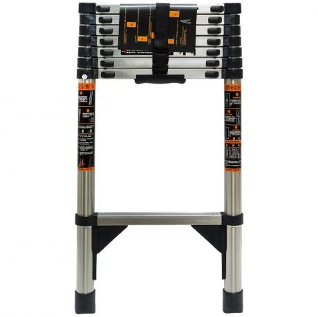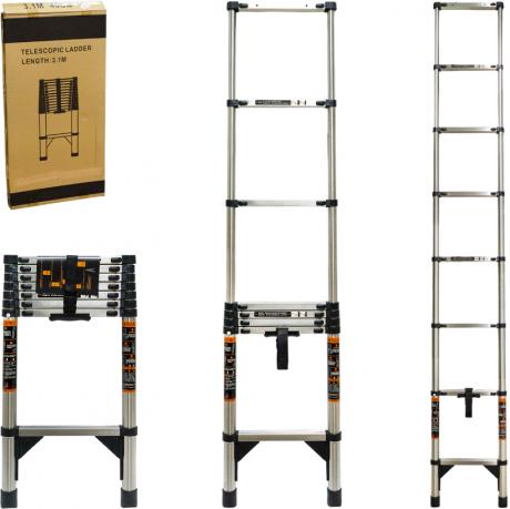 Телескопічна драбина довжиною 3,1 м виготовлена з міцної нержавіючої сталі та розрахована на максимальне навантаження до 150 кг. У складеному вигляді фіксується ремінцями, для зручного перенесення є спеціальне заглиблення під руку. Ширина конструкції — 40 см, довжина у складеному вигляді — 80 см. У комплекті — два запасні фіксатори. Вага виробу близько 8 кг. Упаковка: 46×6×86 см.
