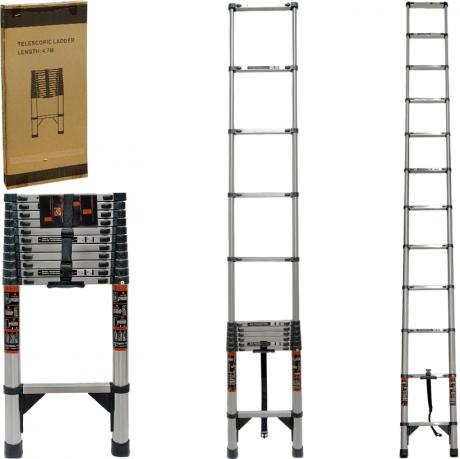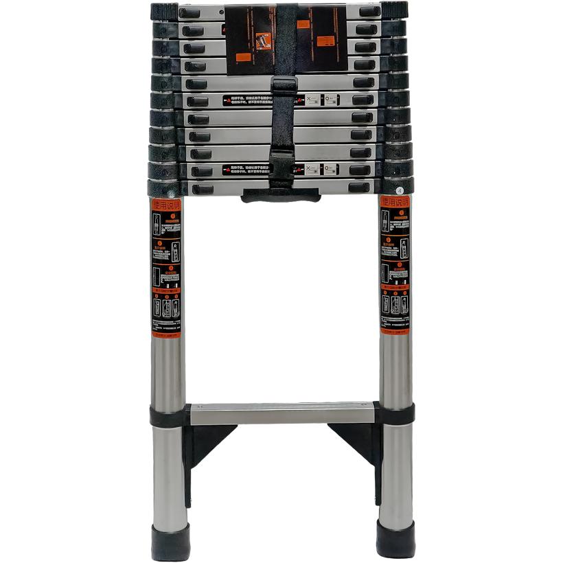 Міцна телескопічна драбина з нержавіючої сталі довжиною 4,7 м, розрахована на навантаження до 150 кг. Компактно складається, фіксується ременями, має зручну ручку для транспортування. Ширина конструкції — 40 см, довжина у складеному вигляді — 80 см. У комплекті — 2 запасні фіксатори. Вага близько 13 кг. Упаковка: 47×7,5×99 см.