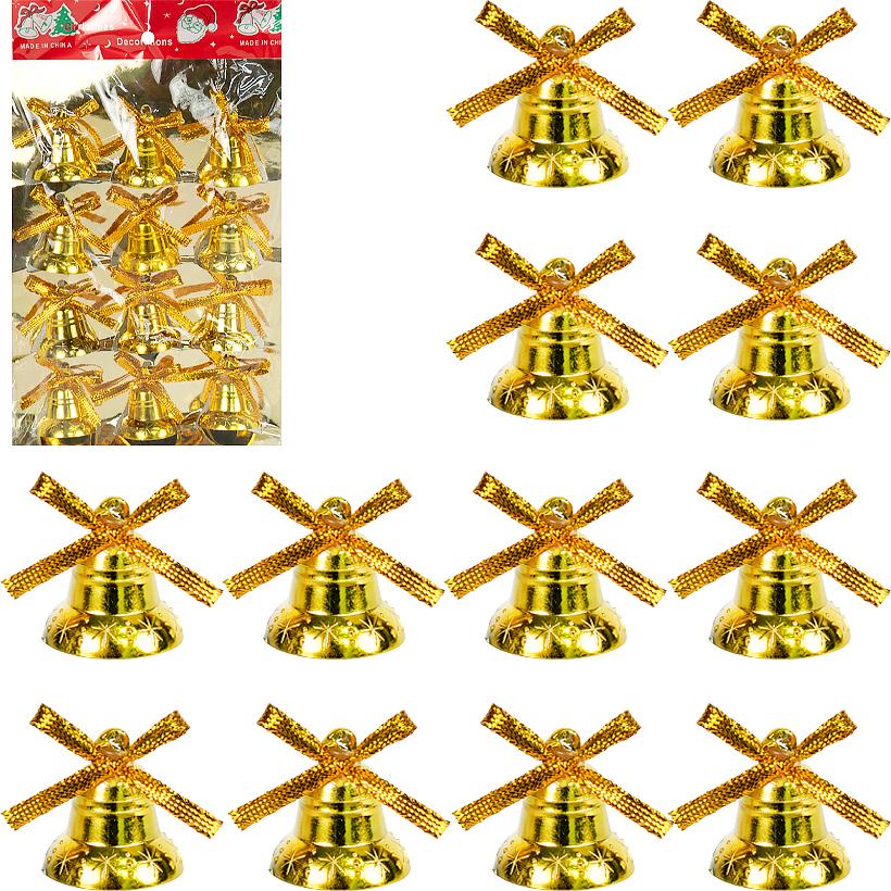 Цей набір включає 12 золотистих пластикових дзвіночків з бантиками. Кожен дзвіночок має розміри 2,5×2,5 см. Продукт поставляється на блістері для зручності зберігання та транспортування.
