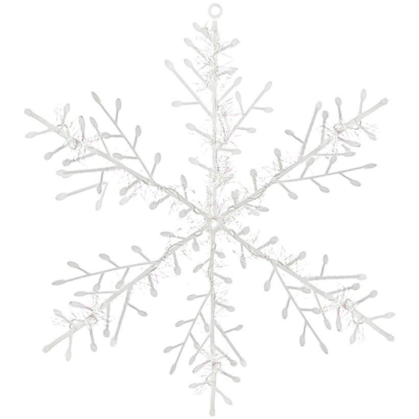 Підвісна прикраса у вигляді білої сніжинки. Декорована блискітками. Можна підвісити на ниточку або вплести в гірлянду. Розмір сніжинки становить 23 см. Ціна вказана за один пакет.