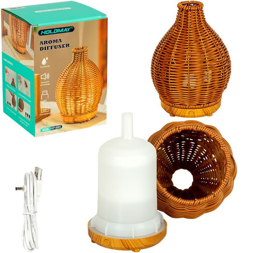 Оригінальний аромадифузор у формі плетеної вази з декоративним LED-підсвічуванням. Працює за ультразвуковою технологією — ефективно зволожує повітря, працює тихо та безпечно. Об’єм резервуару — 80 мл. Живлення через USB (5V, 1A), потужність — 5 Вт. Розміри — 120×120×165 мм, вага — 366 г. Корпус виготовлений з міцного ABS+PP, оформлений у вигляді плетеного декору, що робить його стильним елементом інтер'єру. Ідеально підходить для дому, офісу або як подарунок.