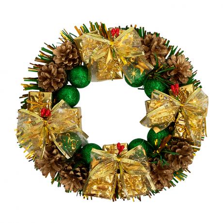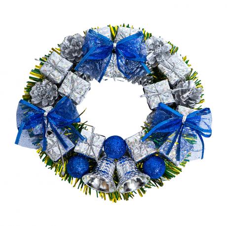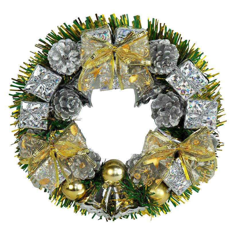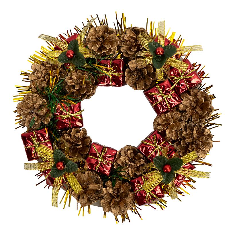 Різдвяний вінок діаметром 22 см — стильна прикраса для святкового інтер’єру. Виготовлений із міцного картону та оздоблений шишками, подарунковими коробочками, стрічками та зеленими елементами, що створюють атмосферу тепла й затишку. Легкий і охайний, вінок можна повісити на двері, стіну або використати як настільну прикрасу. Постачається у прозорій упаковці, зручній для зберігання та транспортування. Ідеально підходить для новорічного декору дому, офісу, вітрини чи святкової композиції.