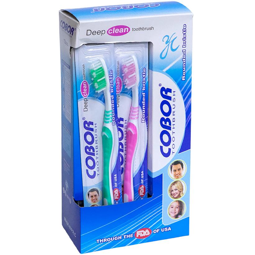 Пластикові гігієнічні зубні щітки «Cobor» із синтетичною щетиною хвилеподібної форми призначені для щоденного комплексного догляду за ротовою порожниною. Хвиляста щетина ефективно очищає поверхню зубів і міжзубні проміжки, допомагаючи видаляти наліт та залишки їжі без шкоди для емалі. Довжина зубної щітки становить 19 см, розмір головки — 3×1 см, висота щетинок — 1,2 см, що забезпечує комфорт і якісне чищення. На зворотному боці головки передбачена ребриста поверхня для очищення язика, яка сприяє зменшенню бактерій і підтриманню свіжого подиху. Кожна щітка має індивідуальну упаковку у блістері розміром 23×4 см з підвісом. Транспортна упаковка 23×12×6 см містить 12 блістерів і підходить для оптового продажу та роздрібної торгівлі.